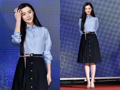 以《我不是潘金蓮》入圍第53屆金馬獎最佳女主角的范冰冰來台,24日晚出席台北金馬紅毯之夜活動,一頭招牌黑長直髮,加上海軍藍襯衫式洋裝造型..