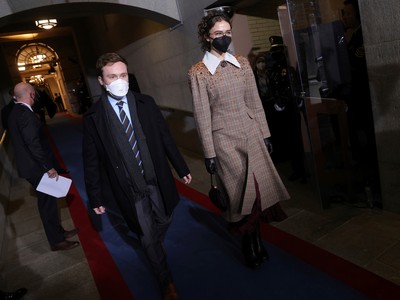 美國總統就職典禮上,副總統賀錦麗(Kamala Harris)的22歲繼女艾拉(Ella Emhoff)因一頭捲髮與文青風圓框眼鏡造型,..