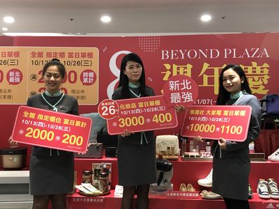 永和比漾廣場周年慶即將在10/19開跑,首4日限定推出化妝品滿3,000元送400元抵用券;大家電消費滿1萬元送1,100元抵用券,為接..