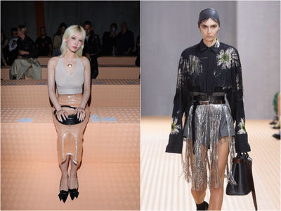 PRADA 2024春夏系列於米蘭時裝周當地時間21日登場,秀場被設有傾洩而下的黏液帶來超現實效果,由創意總監Miuccia Prada..